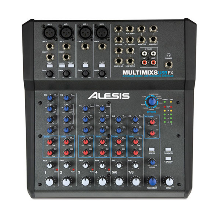 O Alesis MultiMix 8 USB FX é um mixer compacto de 8 canais que oferece E/S versátil e efeitos digitais integrados, tornando-o adequado para reforço de som ao vivo e gravação de música/podcast. Possui quatro canais mono com equalizador de 3 bandas, filtros passa-altas selecionáveis e LEDs de pico, além de dois canais estéreo com equalizador de 2 bandas. Os canais mono podem ser alimentados através de entradas de microfone XLR com phantom power selecionável globalmente ou através de entradas de linha de 1/4" - o segundo canal incorpora um switch para acomodar um instrumento Hi-Z. Botões de envio auxiliar independentes permitem que você envie qualquer canal para o seu processador externo baseado em tempo favorito ou ao processador de efeitos integrado, que fornece uma variedade de efeitos de reverberação, atraso e modulação.