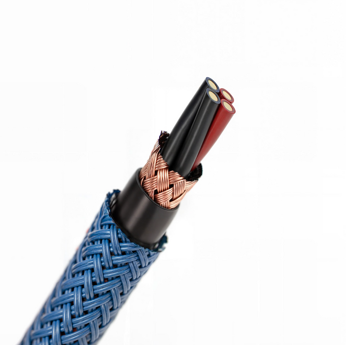 Shielded QuadCore cables, sheathed with durable blue braided sleeve from Sonnect