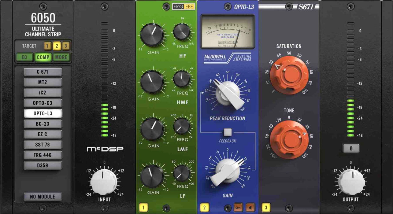 O 6050 Ultimate Channel Strip tem estágios de entrada e saída, envoltos em 3 baias de módulo nas quais qualquer um dos 28 módulos pode ser inserido. Arraste e solte facilmente qualquer módulo para reorganizar o fluxo de sinal do seu channel strip. Um painel seletor de módulo permite uma audição rápida de equalizadores, compressores e efeitos adicionais. Como os plug-ins originais 6020 e 6030, cada novo módulo no 6050 se baseia em designs clássicos e modernos das últimas quatro décadas. A operação é simples e intuitiva, e a qualidade do som é o que os profissionais do mundo todo conhecem nos plug-ins McDSP.