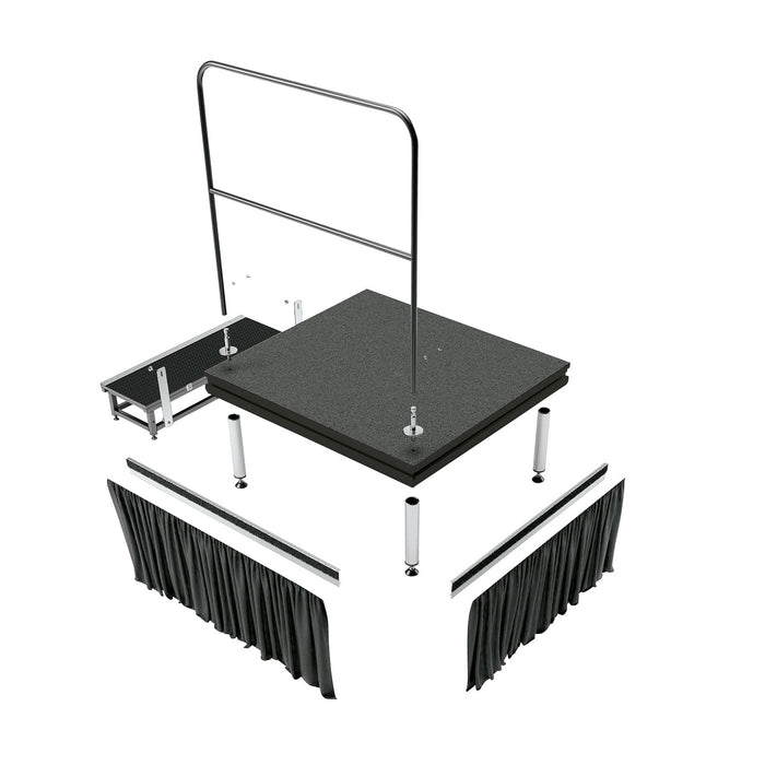 Robusto podio de conductor de aluminio con alfombra resistente que filtra el ruido. Las dimensiones son 1 x 1 m. La construcción liviana ofrece una excelente estabilidad. El accesorio opcional son los pies con clip para aumentar la altura del podio en 20 o 40 cm.