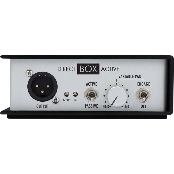 Conecte su guitarra, bajo, teclado u otros instrumentos de alta impedancia al panel frontal de la unidad. El conector Thru se encuentra al lado, para un fácil acceso para conectar una línea a su amplificador, y la señal convertida sale de la unidad a través de un conector XLR robusto en el panel trasero. Los interruptores del panel frontal incluyen Phase, Ground Lift y Amp Out. En el panel trasero, puede seleccionar operación pasiva o activa y elegir activar el pad variable.