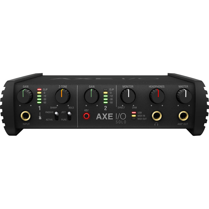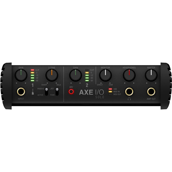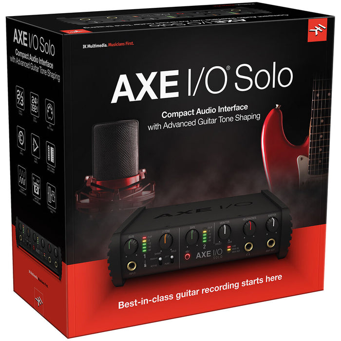 Diseñado para satisfacer las necesidades de guitarristas y bajistas exigentes, IK Multimedia AX I/O Solo es una interfaz optimizada de 2 entradas y 3 salidas con componentes y funciones centrados en la guitarra. La impedancia Z-Tone continuamente variable, junto con configuraciones conmutables para instrumentos activos o pasivos, optimiza el nivel de entrada para aprovechar al máximo su software de audio digital, como el TONEX SE y el AmpliTube 5 SE incluidos. Y puede elegir en la parte frontal enviar su señal a través del circuito PURE transparente del AX I/O Solo o darle vida con el estadio de entrada JFET de la unidad. La conversión digital de alta calidad y la sincronización con baja fluctuación brindan un sonido nítido, y un único preamplificador de micrófono Clase A es ideal para grabar voces y otros instrumentos para respaldar sus increíbles líneas de guitarra. Equipado con una salida de reamplificación dedicada y entradas de controlador dedicadas, el AX I/O Solo le ayuda a aprovechar al máximo lo que su equipo analógico y digital tiene para ofrecer. Agregue a eso una enorme colección de amplificadores virtuales, procesadores de señal y una licencia de Ableton Live Lite, y AX I/O solo le brinda las herramientas que necesita para realizar sus mejores grabaciones. Ya sea que estés creando en el estudio casero o mientras estás de viaje, los guitarristas recomiendan la interfaz AX I/O Solo.