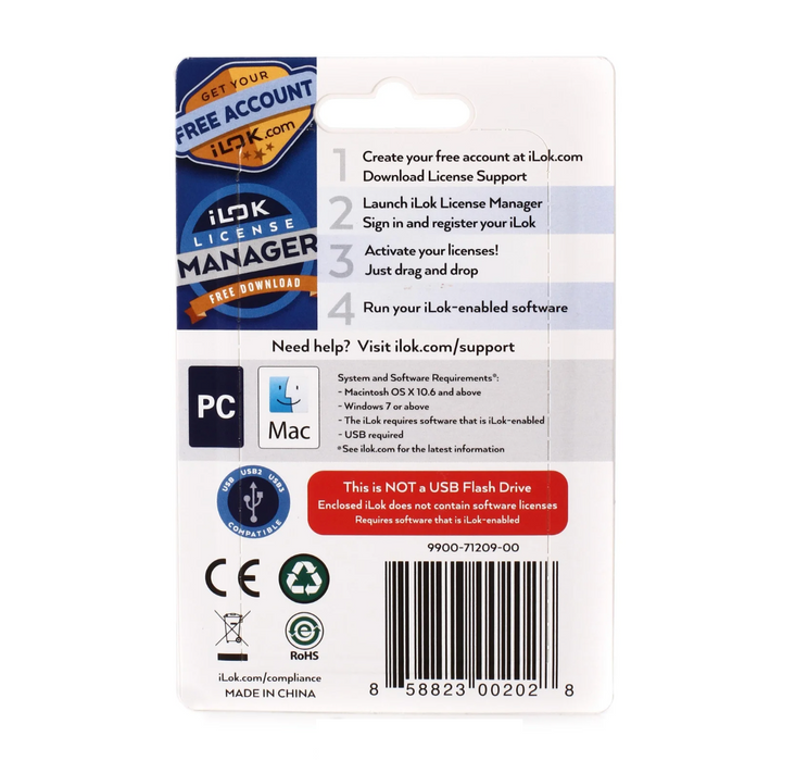 Você pode armazenar até 1.500 licenças na terceira geração do iLok, o que é três vezes mais do que na geração anterior. E com 1,5" x 0,5", é o menor iLok já produzido. Apesar disso, é super durável devido ao seu chassi de alumínio à prova de rachaduras e rachaduras. Os possíveis ladrões terão dificuldade em roubar seu iLok, já que o novo modelo possui uma presilha de segurança mais larga e resistente, compatível com a maioria dos cabos de segurança para desktops, e seu número de série gravado não sai sem um esforço considerável. Um logotipo gravado estiloso torna a falsificação extremamente difícil, garantindo que seu iLok seja autêntico. A terceira geração do iLok vem com um indicador de LED azul brilhante.
