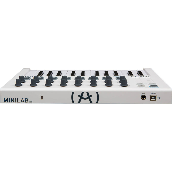 O MiniLab MkII da Arturia é um controlador MIDI compacto e portátil que acompanha um conjunto abrangente de software de produção de áudio. Ele possui 25 teclas sensíveis, 8 pads retroiluminados sensíveis à velocidade e à pressão com 2 pad banks internos, 16 codificadores e touch strips capacitivos e responsivos para Pitch Bend e modulação.