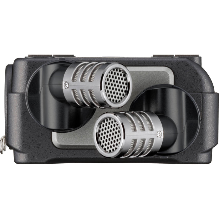 Os microfones condensadores integrados duplos oferecem configurações estéreo XY e AB;