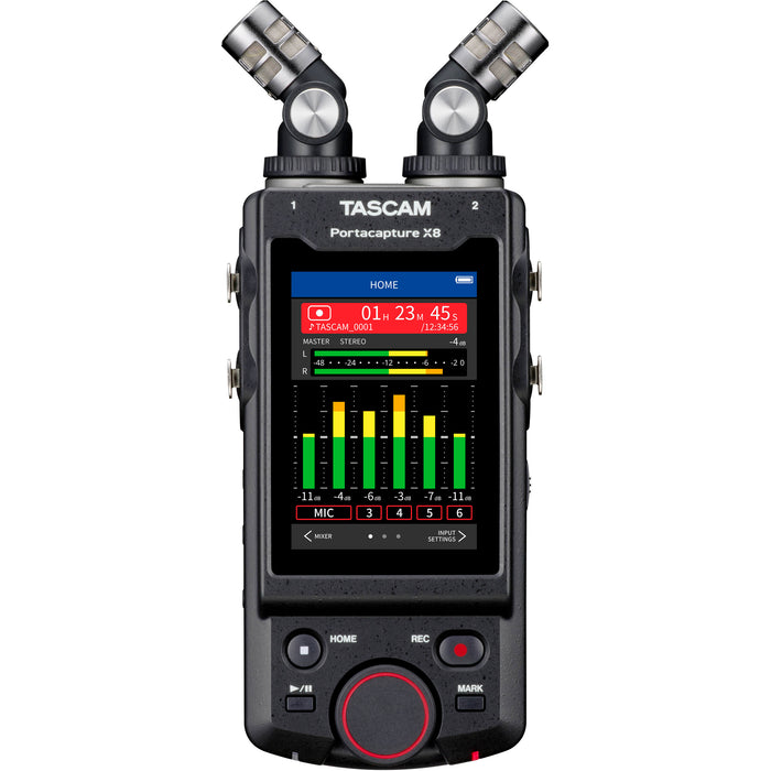 Conectividade é o nome do jogo quando se trata de gravação portátil. Felizmente, o TASCAM Portacapture X8 tem opções de E/S mais do que suficientes para qualquer tipo de projeto que você possa imaginar. Além dos dois microfones integrados, o Portacapture X8 possui quatro entradas XLR/TRS com travamento completas com pres de microfone HDDA projetados pela TASCAM. Você também obtém uma entrada de áudio da câmera que oferece controle sem fio por meio do aplicativo TASCAM Portacapture Control e do adaptador Bluetooth AK-BT1 (vendido separadamente). Além das entradas analógicas, o Portacapture X8 também funciona como uma interface de áudio USB para que você possa gravar diretamente em sua DAW. A conectividade abundante permite que o Portacapture X8 grave oito trilhas simultaneamente (6 trilhas e mixagem estéreo). Esteja você gravando uma seção de sopro ska, áudio no local ou seu episódio de podcast inovador, o Portacapture X8 irá capturá-lo com facilidade.