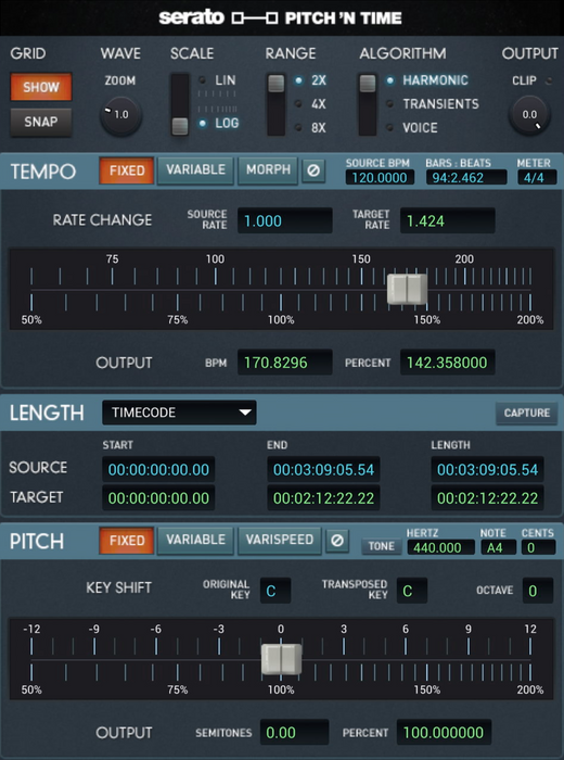 Pitch 'n Time Pro da Serato é um plug-in de ajuste de tempo e tom que usa um algoritmo patenteado de compressão/expansão de tempo e mudança de tom para processamento sem falhas.