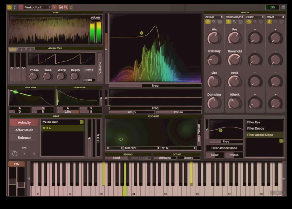 Nosso novo sintetizador é um sintetizador profissional, versátil e subtrativo. Pode ser facilmente feito para soar como qualquer coisa, desde um órgão doce e leve até um clave afiado e funky. Existem várias vozes, sensibilidade à velocity, switching mono/polifônica, LFOs e filtros versáteis e efeitos. Resumindo, tudo o que você esperaria de qualquer um dos sintetizadores mais profissionais.
