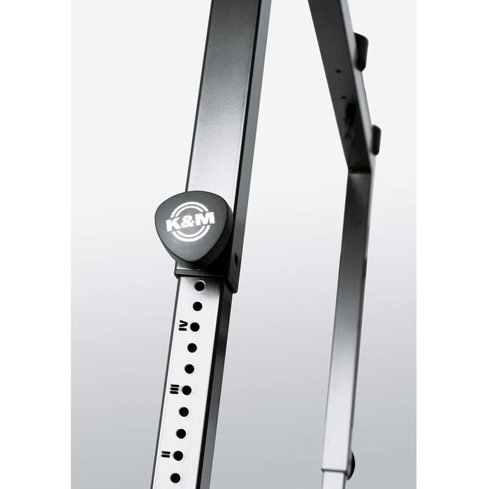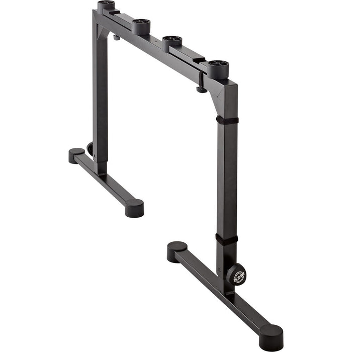Sua construção compacta em tubo de aço e grandes tampas redondas de nivelamento tornam este atraente suporte de teclado significativamente mais estável. Parafusos de travamento com mola de dois lados facilitam o ajuste preciso da altura. Os braços de suporte podem ser ajustados de acordo com o tamanho do teclado. Quando dobrada, a mesa é impressionantemente plana. O design desta mesa combina com os bancos de piano 14080, 14081, 14085, 14086 e 14087. Um extra opcional são os empilhadores 18811 para um segundo nível e 18822 para um terceiro nível, permitindo o uso de um segundo ou terceiro teclado/laptop. Use o adaptador 18814 para montar o suporte universal 18817 de forma fácil e rápida.